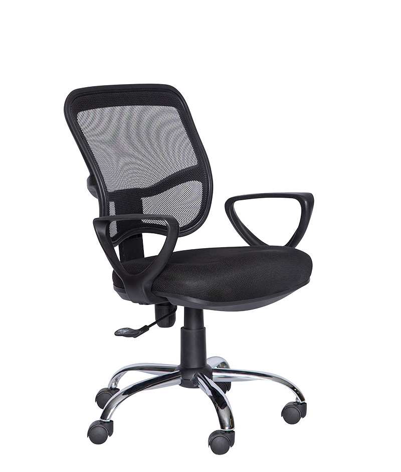 Pistón secretarial, con cubierta telescópica, base cromada de 26″ de 5 puntas, brazos fijos de polietileno rígido, mecanismo secretarial, ajuste neumático de altura.